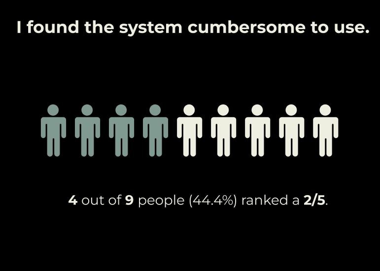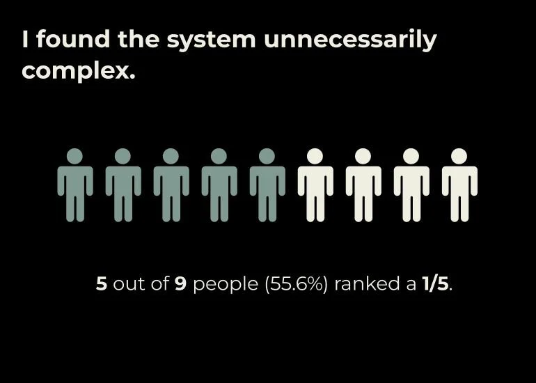 Using five questions from the System Usability Scale, I wanted to understand what users were feeling while navigating through the prototype to create a simpler and more user-friendly experience for users. The scale ranges from 1 (strongly disagree) to 5 (strongly agree).